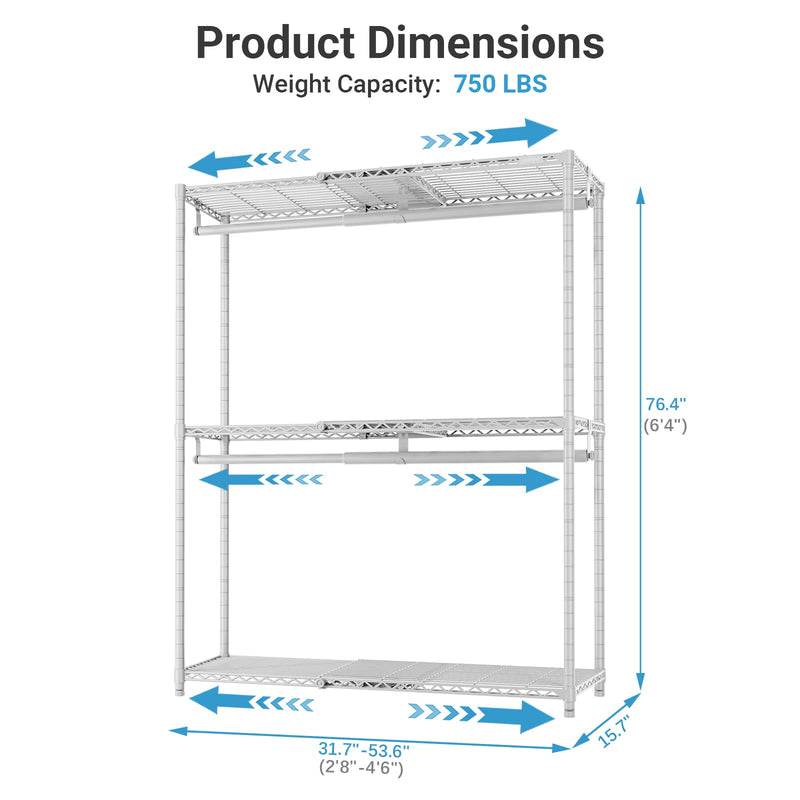 VIPEK X1 Plus Expandable Clothes Rack is a versatile storage solution, adjustable from 2'8" to 4'6", featuring 3 expandable shelves and 2 extendable hanging rods. Ideal for small spaces, this heavy-duty rack supports up to 580 lbs, ensuring stability with its high-quality carbon steel construction. Perfect for bedrooms, dorms, and laundry rooms, it offers flexible organization for clothing and accessories while being easy to assemble with clear instructions.