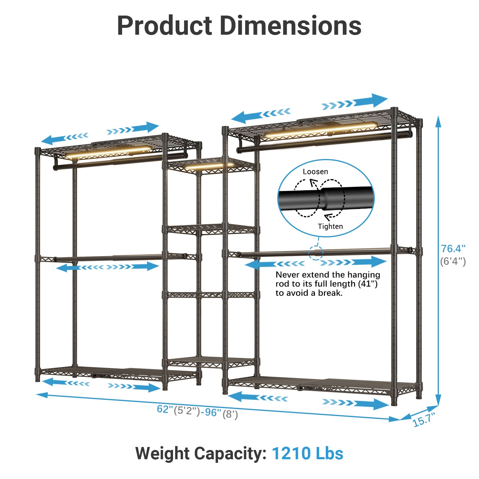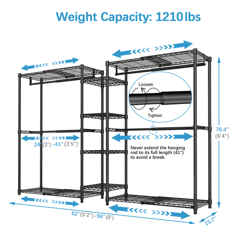 - Dimensions & Load Capacity: (62"-96")W x 15.8"D x 76.4"H, X3 clothing rack maximum load capacity 1210 lbs., constructed of high-quality carbon steel, sturdy and reliable, it is long-lasting and features anti-tip devices to prevent unexpected falling