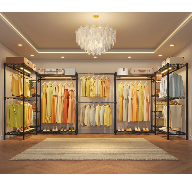 - MULTIFUNCTION STEEL CLOSET SYSTEM ORGANIZER: 5 Tiers clothes racks for hanging clothes, placing accessories, bedding, lining, shoes, etc. Easily maximize your storage space by providing shoe storage, double hang storage, long hang storage, folded storage.