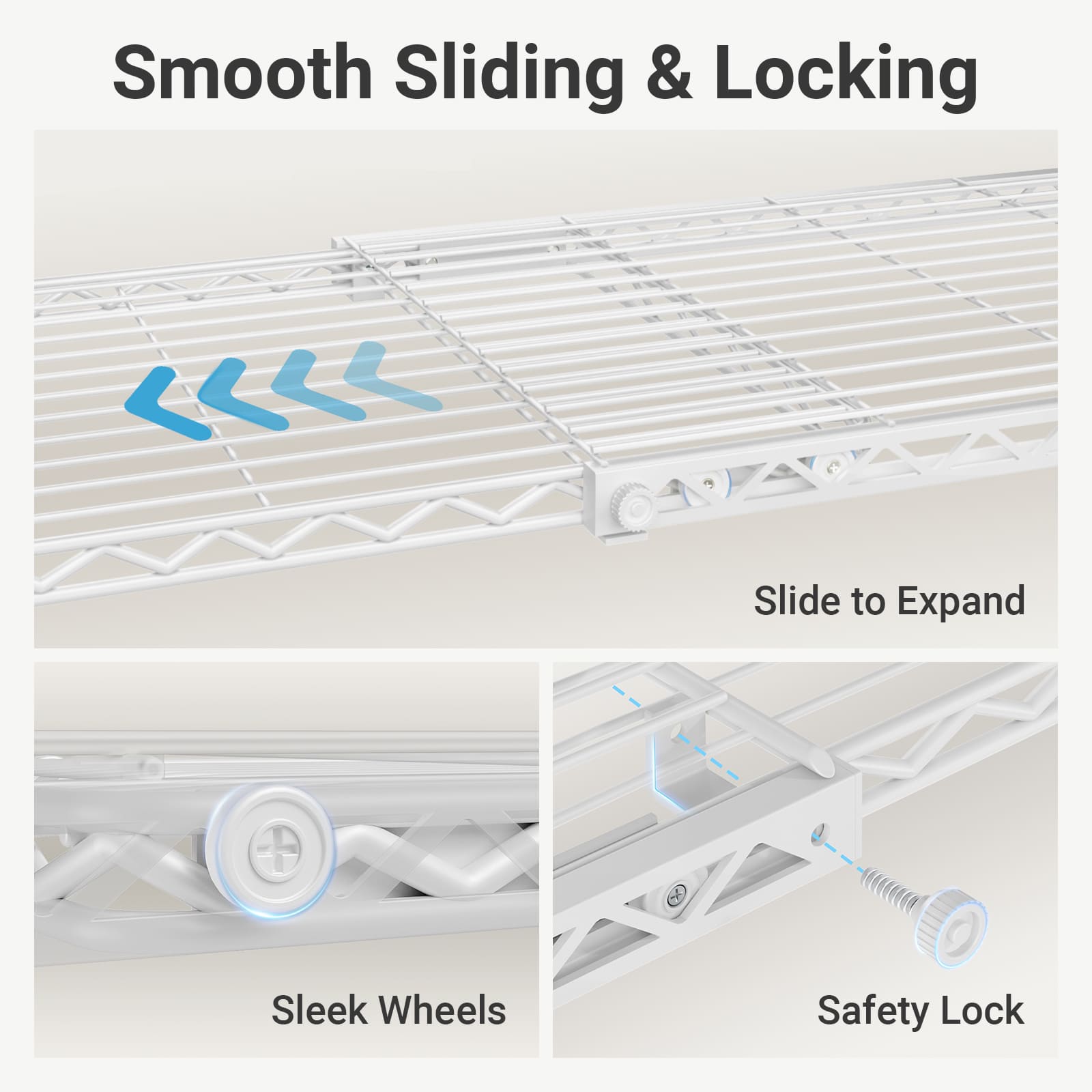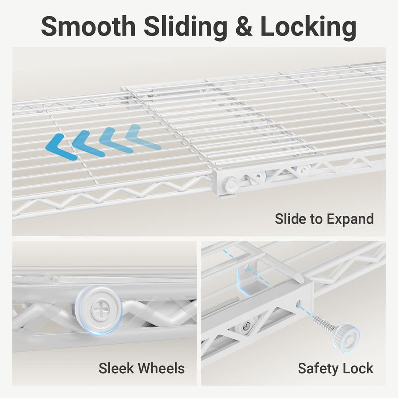 - Flexible Adjustment & Secured Locking: All the wire shelves and hanging rods can be lengthened or shortened (24" to 41") based on your needs. They are equipped with secured locking gadgets, eliminating the annoyance of overextending