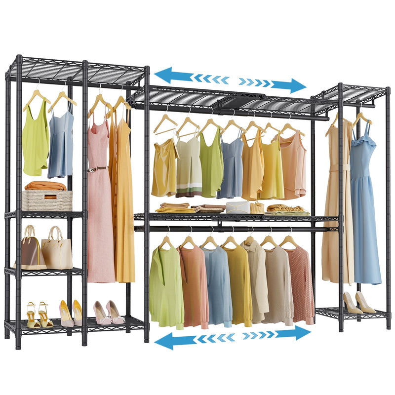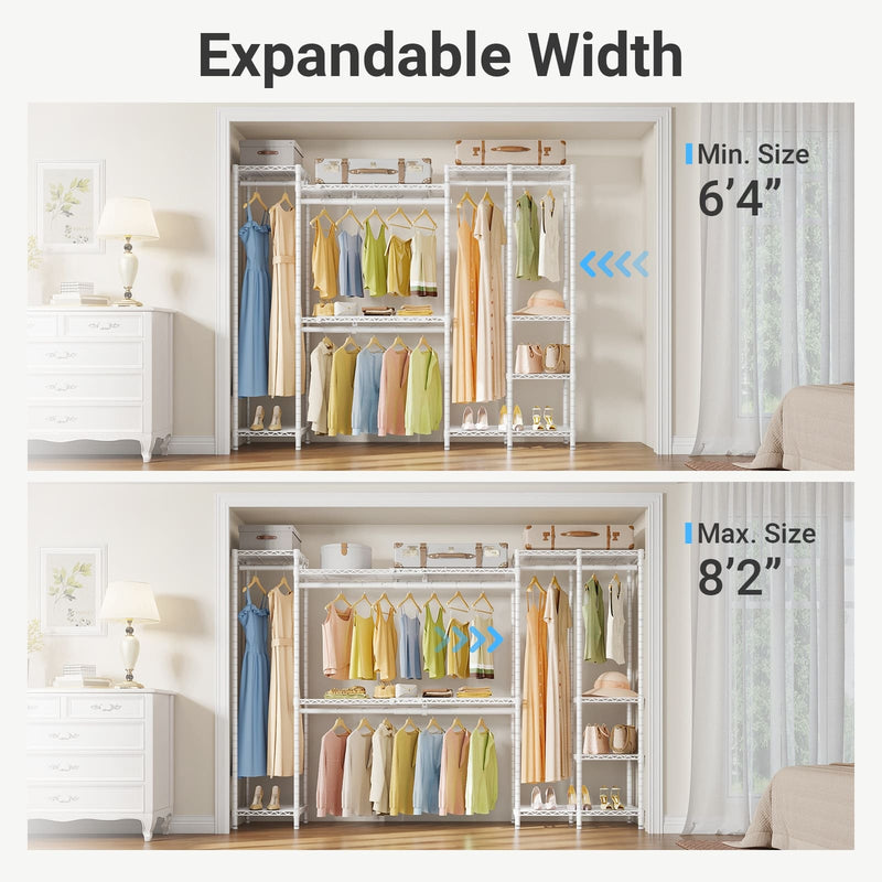 VIPEK X4 Expandable Clothes Rack offers adjustable width from 6'4" to 8'2" with two assembly options—horizontal for large closets and L-shape for corners—maximizing your storage space. Made of durable, powder-coated carbon steel, it supports up to 1240 lbs and features extendable shelves and rods with secure locks for stability. Easy to assemble, it’s perfect for organizing heavy garments and accessories in walk-in closets, bedrooms, and more.