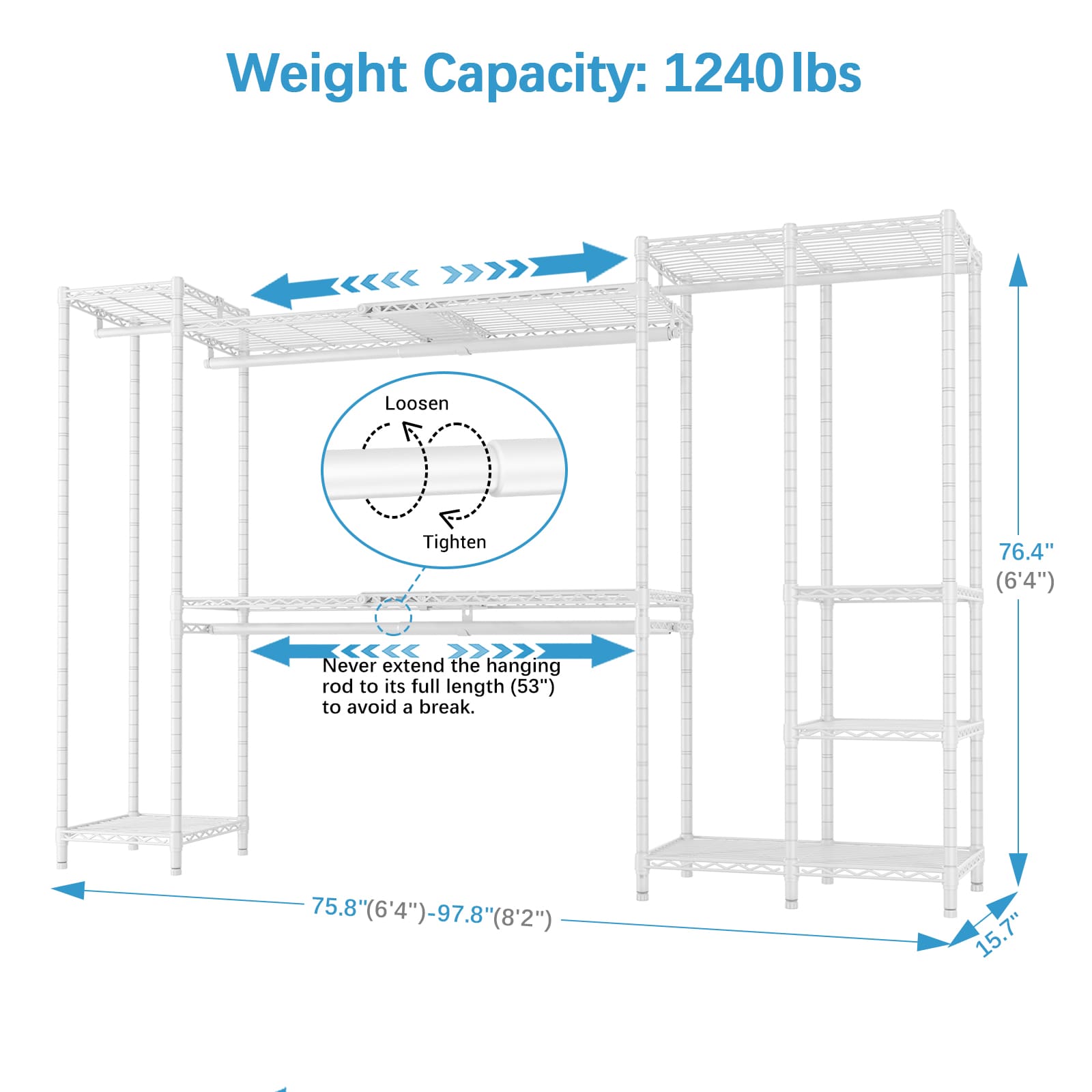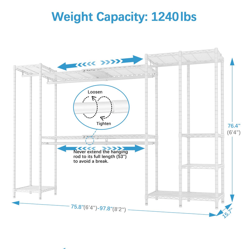 - Dimensions & Load Capacity: (76"-98")W x 15.7" D x 76.4" H. Load capacity up to 1240 lbs. Single extendable shelves and hanging rods can be lengthened or shortened (32" to 53") based on your needs. They are equipped with secured locking gadgets, eliminating the annoyance of overextending